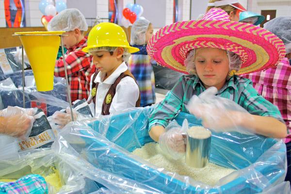 A party-like atmosphere set the mood with fun hats and dance music, as students were stationed at tables laden with bins full of rice, dehydrated vegetables, dehydrated cheese sauce and a proprietary soy protein mix with vitamin and minerals that creates a broth when mixed with water. They were then taught to measure, scoop and feed the funnel as they filled plastic bags with the proper amount of ingredients to make a meal for six to eight people with only the addition of water.