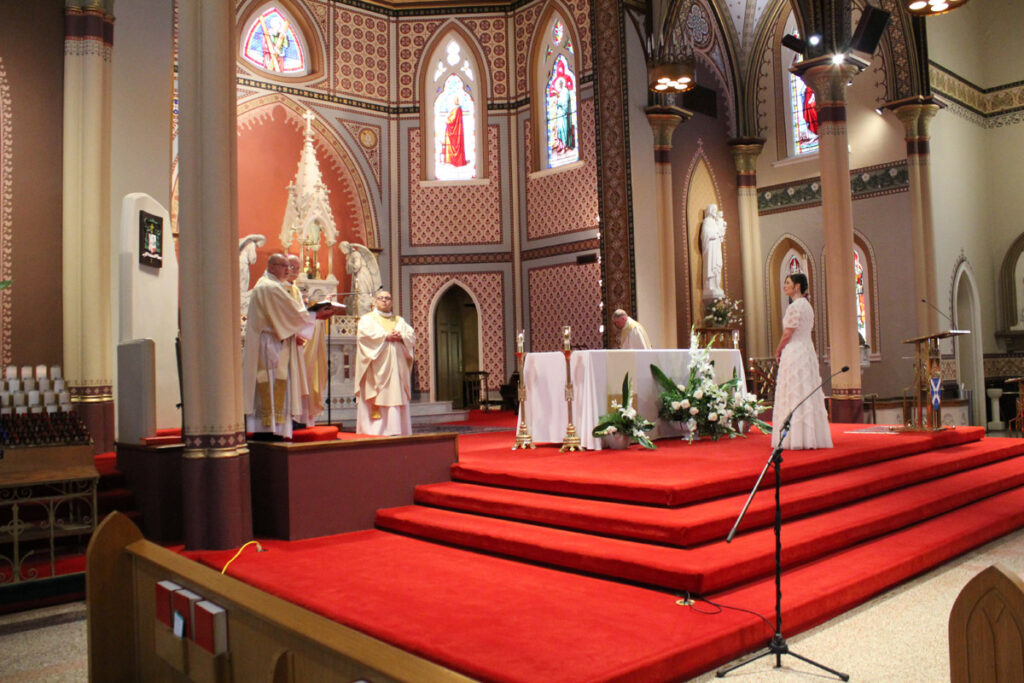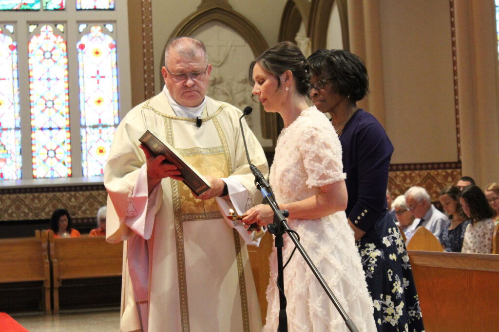 Mary Kelly states her intent to become a consecrated virgin, reading from the holy book held by Deacon Chuck Ashburn, and joined by her mentor Dr. Theresa Marshall, during Mass at the Cathedral of St. Andrew in Little Rock July 6. (Katie Zakrzewski)